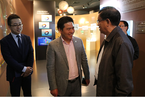 来访领导龙永图(右二)与蒋锡培(中)现场交流 蒋锡培为来宾讲解远东发展历史,智慧能源的运营、管理、战略布局等情况,龙永图被远东智慧能源科技馆中的现代化高科技展示深深吸引,仔细观察馆内各产品模型,体验产品不断优化发展进程,对远东企的发展有了更加深入的了解,并对远东取得的成就表示赞叹。