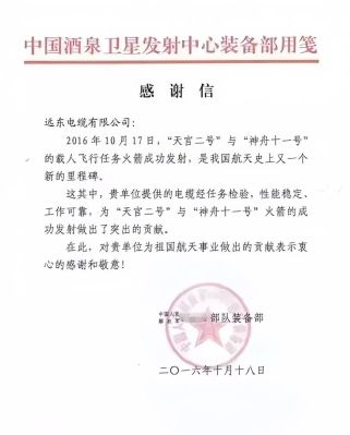 时间拉回八年前,远东电缆收到过一封来自酒泉卫星发射中心的感谢信,记录了“紧急时刻”下远东电缆与中国航天的链接。2016年9月16日晚近12时,“神舟十一号”发射工作已经进入调试阶段,远东电缆突然接到来自酒泉卫星发射中心的电话,中心表示希望公司能在三天内,赶制一批航空用高端电缆产品并送至酒泉,助力航天基地建设及“神州十一号”发射。“公司接到任务快速反应,全力赶工,最终用72小时的“火箭速度”不辱使命交上满意答卷。”远东电缆相关负责人表示。