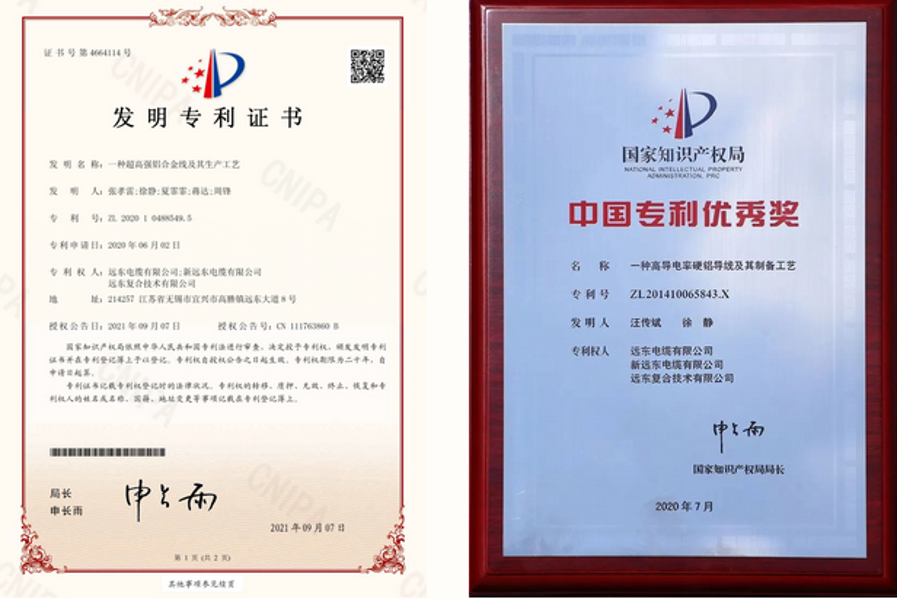 由远东电缆经过多年技术攻关研发出的特高压线路用高导铝及铝合金系列产品是具有多项发明专利的核心产品,无论是硬铝导电率还是高强度铝合金导电率等性能都处在国际领先水平,并荣获中国专利奖。