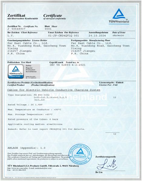远东电缆在液冷系统配套领域的技术实力已得到行业验证。远东电缆自主研发的液冷大功率充电桩电缆,早在2021年就获得了莱茵TÜV在国内颁发的首张液冷充电桩电缆产品认证证书,助建了2022年北京冬奥运场馆的新能源汽车超级充电站。在液冷循环系统的助力下,电缆直径大幅缩减,重量显著减轻,用户单手即可轻松操作充电枪,告别了以往“哑铃式”的笨重体验。即使在超过1500kW乃至更高功率下持续工作,电缆温度依然稳定可控,安全可靠。这项技术大幅度提升了电动汽车和电动卡车的充电效率,给用户带来更好的使用体验。