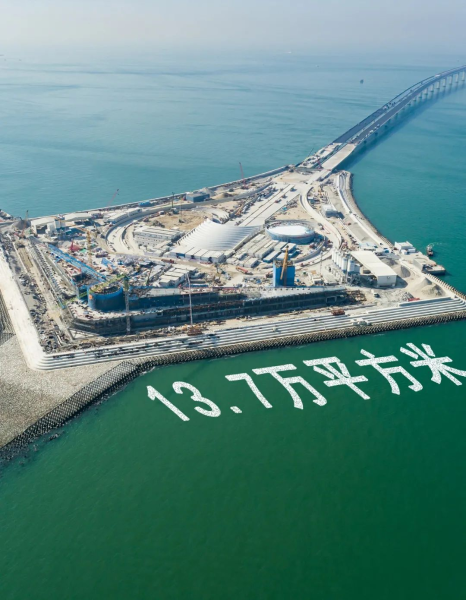 The SZL’s western artificial island is 625 meters long, up to 456 meters wide, with a total area of 137,000 square meters—equivalent to 19 international standard football fields. It is the world’s largest artificial island formed by steel cylinder enclosures. Serving as a critical hub and pioneering project for the bridge-to-tunnel transition, it is hailed as the "Kunpeng of the sea" in the Guangdong-Hong Kong-Macao Greater Bay Area.