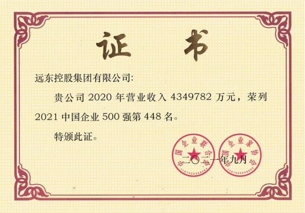 2021年,远东再次上榜“中国企业500强”“中国民营企业500强”“亚洲品牌500强”。