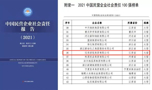 12月21日,全国工商联发布了“中国民营企业社会责任100强”榜单,远东控股集团位列第36位。